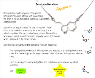 Newsflash:My birthday serotonin necklace came today!!! From madewithmolecules.com as a present from my parents. I'm excited, I've wanted it a while, since my friend Kerri got it. My twin & I originally got necklaces from www.madewithmolecules.com for Christmas last year – I got the “Focus” and my sister got “Creativity” – the jewelry-maker was an ex-post-doc of my grandfather's in chemistry – and then Kerri saw it and loved it and got the serotonin one and then I was jealous of it. And my friend Sarah has one as well. Maybe the serotonin molecules resting on my neck will inspire me and infuse me with their molecularly goodness. Just a thought. GOOD NIGHT.